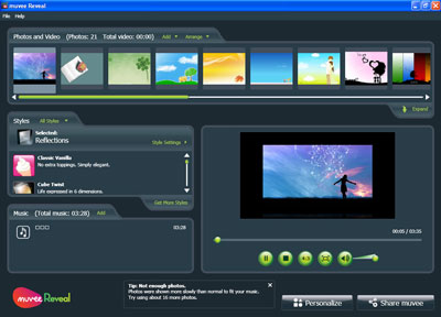muvee Reveal sẽ tự động tạo ra một bộ phim thú vị từ tất cả tập tin ảnh của bạn. Chỉ cần lựa chọn video và hình ảnh. Sau đó, chọn lựa một mẫu Style sao cho phù hợp với mong muốn của mình. Tiếp theo, hoàn chỉnh câu chuyện của bạn bằng cách sử dụng các bảng thiết kế chuyên nghiệp, lựa chọn phông chữ và chú thích.