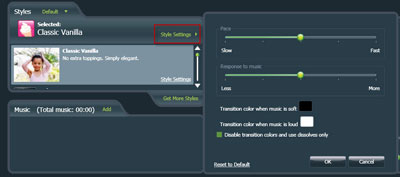 - Styles: chương trình cung cấp cho bạn 10 hiệu ứng đẹp mắt cho album, bạn chọn một kiểu rồi bấm nút Play ở khung xem thử để xem trước album. Nếu muốn thay đổi tốc độ cũng như các thiết lập (màu sắc, hình ảnh, hình nền…) của hiệu ứng, bạn chọn Style Settings, mỗi một hiệu ứng sẽ có những tùy chọn khác nhau. Bấm Reset to Default để trở về mặc định.