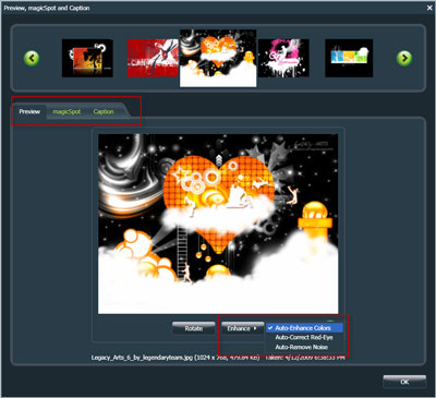 Ngoài chức năng chính là tạo album ảnh, chương trình còn có khả năng chỉnh sửa ảnh, khử mắt đỏ, và chèn thêm chú thích vào ảnh, video. Bạn bấm đôi chuột vào ảnh để mở cửa sổ chỉnh sửa ảnh. Tại thẻ Preview, bạn bấm nút Enhance > Auto–Enhance Colors để thay đổi độ sáng, màu sắc của bức ảnh, để khử mắt đỏ bạn bấm Auto-Correct Red-Eye, để khử nhiễu hột bạn chọn Auto-Remove Noise.