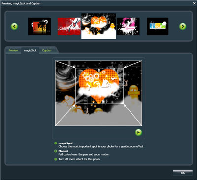 Thẻ magicSpot giúp bạn phóng to (zoom) một vùng quan trọng, để người xem có ấn tượng về vùng này. Bạn chỉ cần kéo ánh sáng hình tròn đến vùng cần zoom. Nếu muốn tùy ý chỉnh kích thước vùng cần zoom, bạn đánh dấu vào mục Manual rồi rê chuột vào 4 góc hình chữ nhật để thay đổi kích thước hình chữ nhật.
