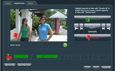Thẻ magicMoment cho phép bạn cắt bỏ bớt một đoạn hoặc chọn ra những đoạn quan trọng (Highlight) trong video, để trong trường hợp độ dài album ngắn hơn độ dài video thì những đoạn được đánh dấu Highlight sẽ được ưu tiên xuất hiện. Để đánh dấu, bạn bấm nút Play để chơi video bình thường, khi đến đoạn cần bỏ, bạn bấm Exclude, ngược lại bấm Highlight. Để bỏ đánh dấu, bạn chọn Unmark.