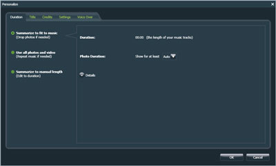 - Duration: độ dài album, bạn chọn Summarize to fit music để trình chiếu album theo đúng độ dài nhạc nền, chọn Use all photos and video để trình chiếu toàn bộ ảnh và video bình thường (lặp lại nhạc nền nếu cần), chọn Summarize to manual length nếu muốn xác định thời gian cụ thể.