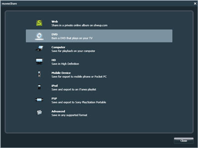 Bạn bấm nút Share muvee, để ghi album ra thành VCD/DVD trình chiếu trên đầu DVD gia dụng, bạn chọn mục DVD, chương trình còn hỗ trợ bạn tạo menu cho DVD với 10 kiểu giao diện rất bắt mắt.